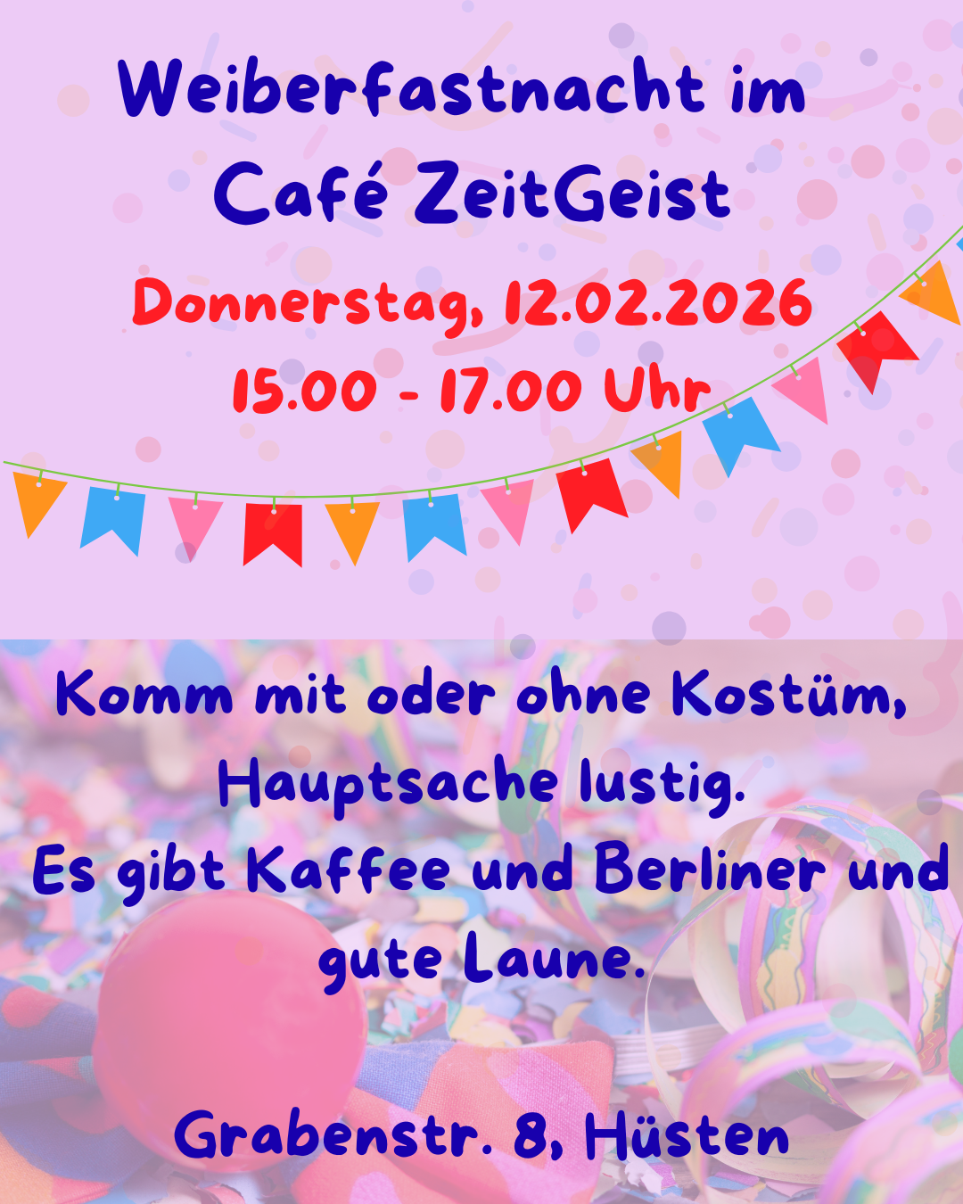 Am Weiberfastnachtstag wird es bei uns lustig! Wir laden herzlich ein zu einem fröhlichen Nachmittag bei uns im Café.