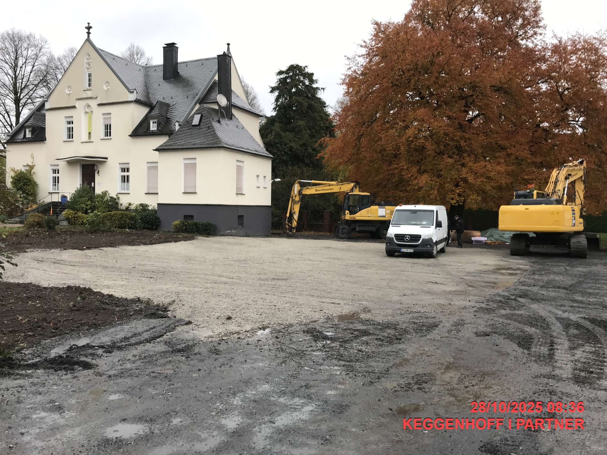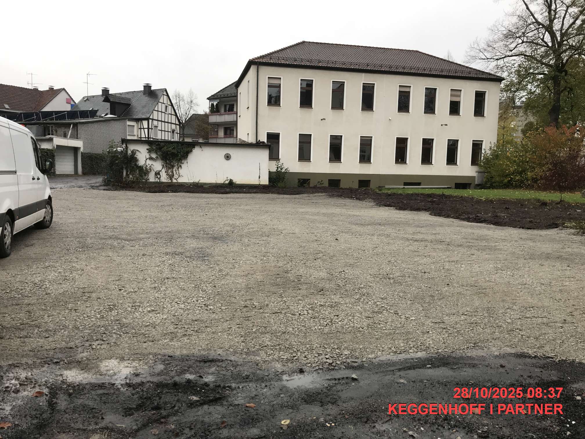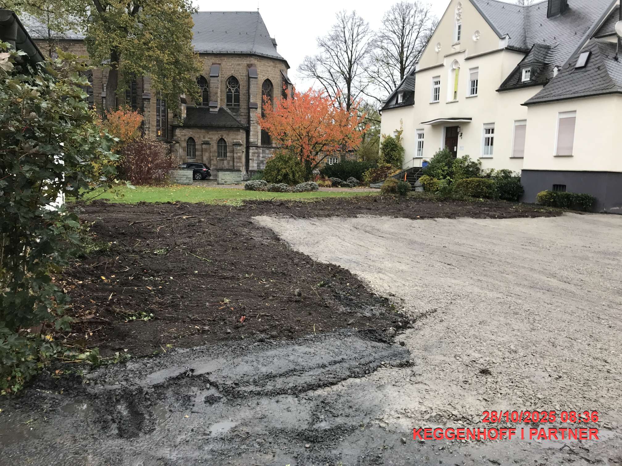 Erstellte Schotterfläche dient zunächst als Fläche zum Parken für alle Nutzer / Besucher der Pfarrkirche St. Petri und des Petrushauses in Hüsten.