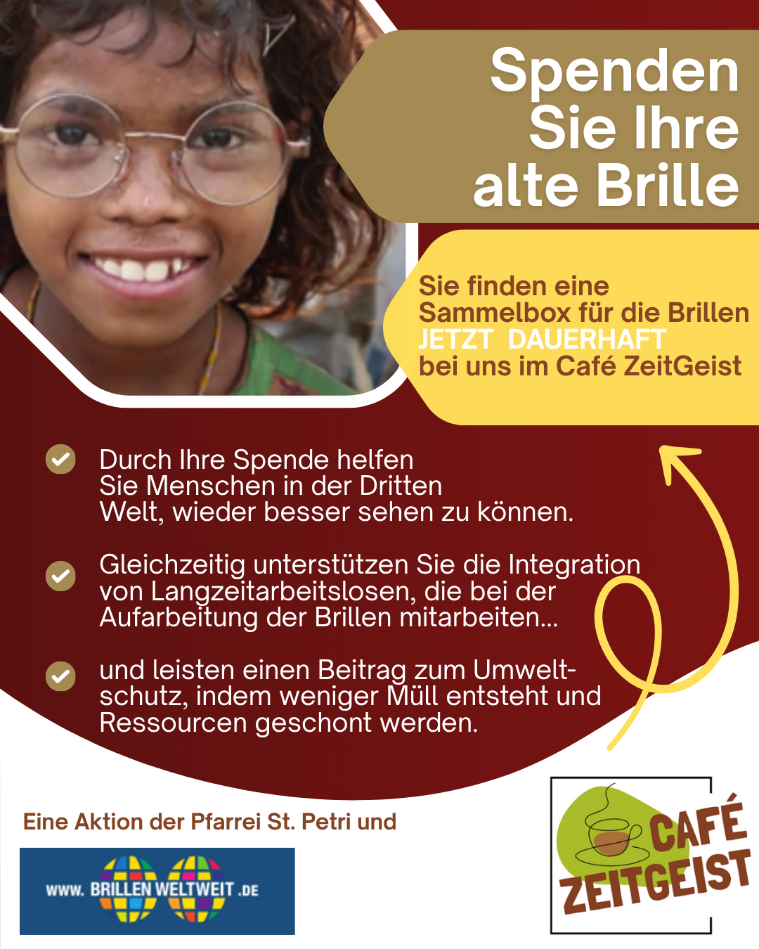 Ihre Reaktion auf unseren Aufruf war so überwältigend, dass sich der Arbeitskreis Caritas und das Team vom Café ZeitGeist entschieden haben, die Sammelaktion nicht zu beenden. Bis auf weiteres finden Sie die Sammelbox für gebrauchte Brillen im Café ZeitGeist.