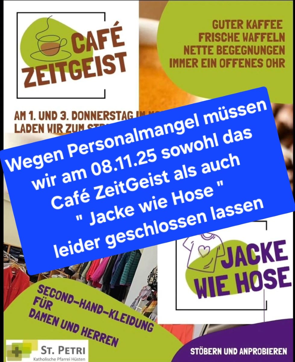 Wegen Personalmangel müssen Café ZeitGeist und "Jacke wie Hose" am 08.11.25 leider geschlossen bleiben!