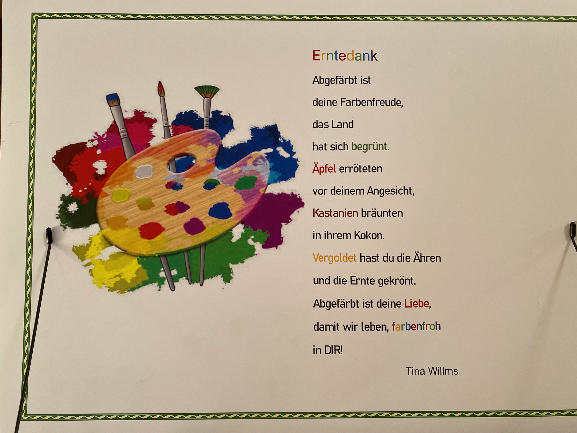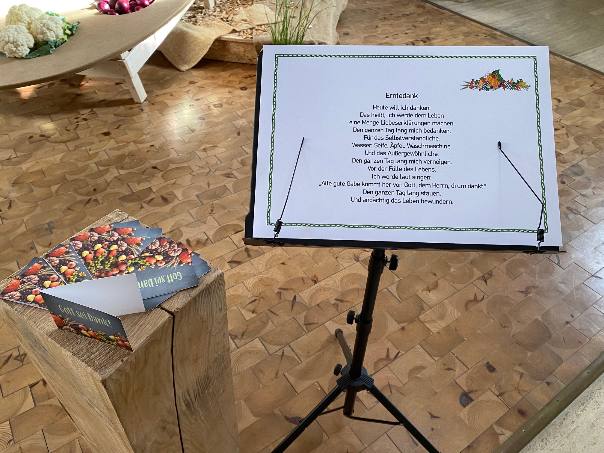 Erntedank – Nach der anstrengenden Erntezeit schauen wir auf die Mühen und die Früchte der Arbeit und des Lebens – dankbar, in dem Wissen, dass vieles zusammenkommen muss, damit wir leben, überleben, gut leben: förderliche Bedingungen, das Wetter und fruchtbarer Boden, Gesundheit, Arbeitskraft, Glück, Kraft und Ausdauer, ein tatkräftiges Miteinander … Gott sei Dank für alles!
