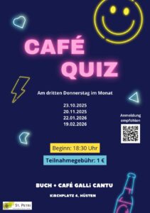 Ab dem 23. Oktober ist es wieder soweit: Am dritten Donnerstag im Monat können Sie im Buch + Café Galli Cantu (Kirchplatz 4 in Hüsten) Ihr Wissen testen. Gequizzt wird jeweils ab 18:30 Uhr in Teams von 2 bis 4 Personen. Eine Anmeldung wird empfohlen und ist online möglich unter: „bit.ly/GalliCantu“. Auch Einzelpersonen können sich anmelden und vor Ort einem Team anschließen. Die Teilnahmegebühr beträgt 1 €. Das gesammelte Geld geht an das Team mit den meisten richtigen Antworten. In der gemütlichen Atmosphäre des ehrenamtlich betriebenen Cafés stehen alkoholfreie Getränke zur Verfügung. Weitere Termine finden statt am: 20.11., 22.01. und 19.02.