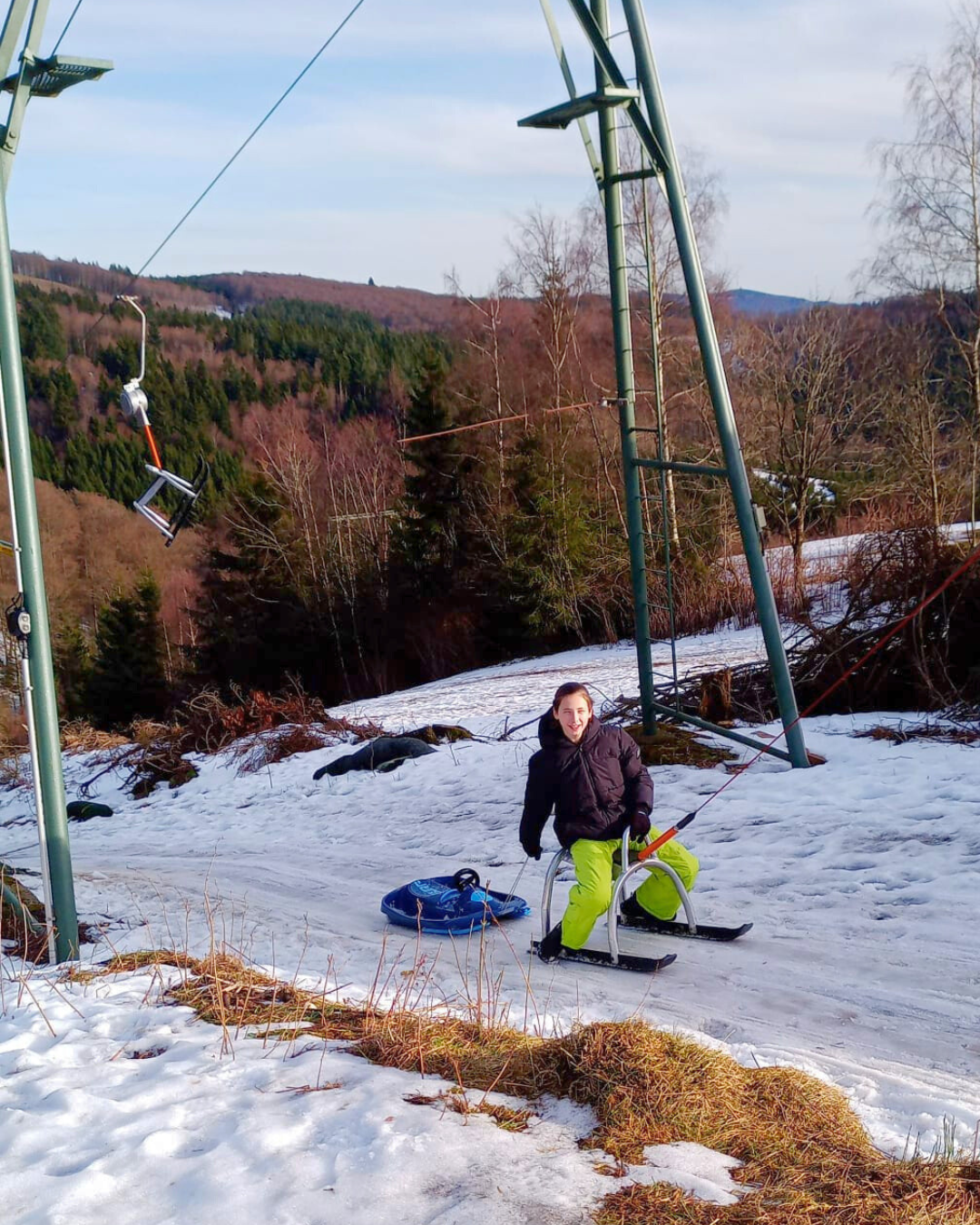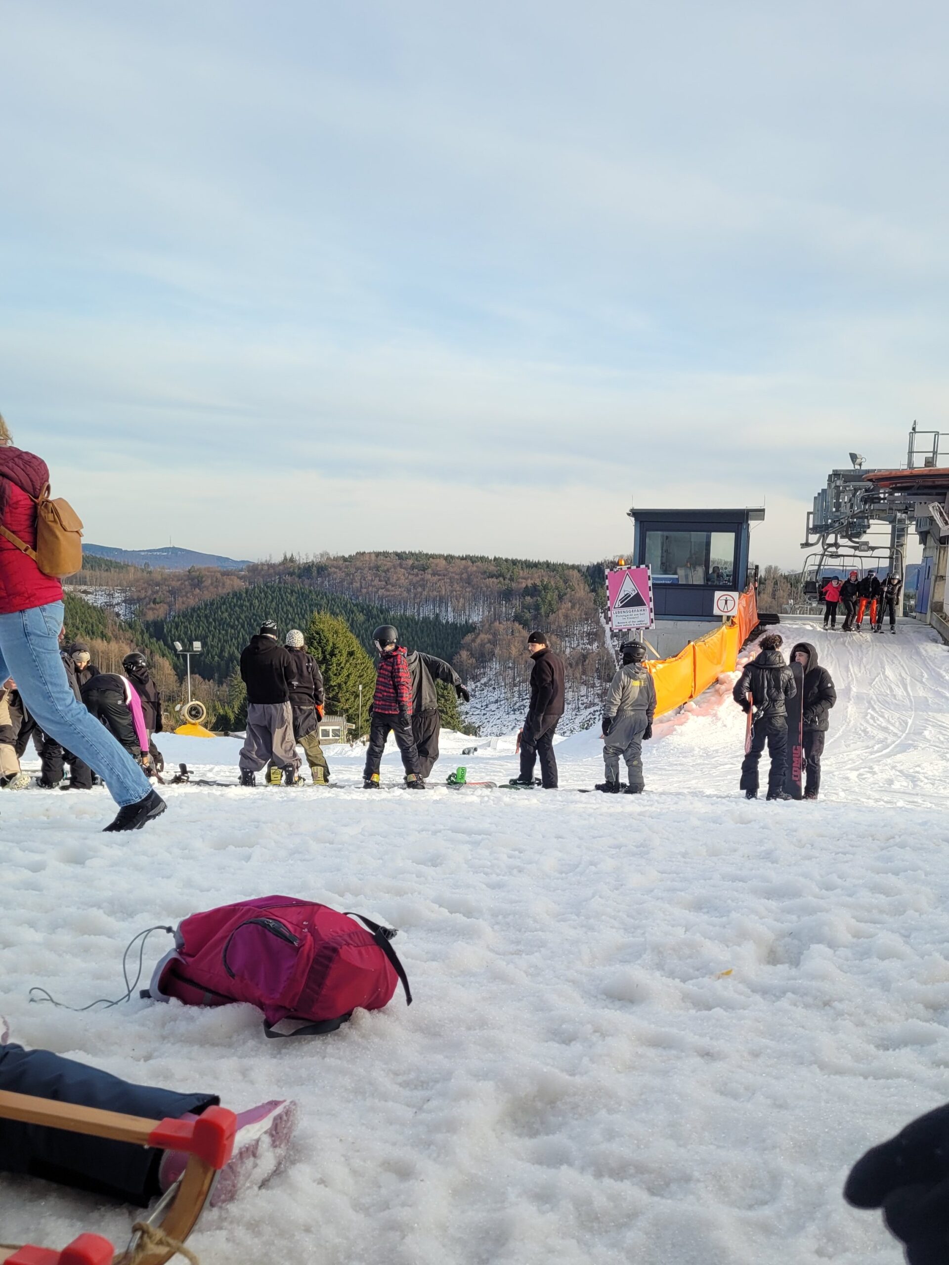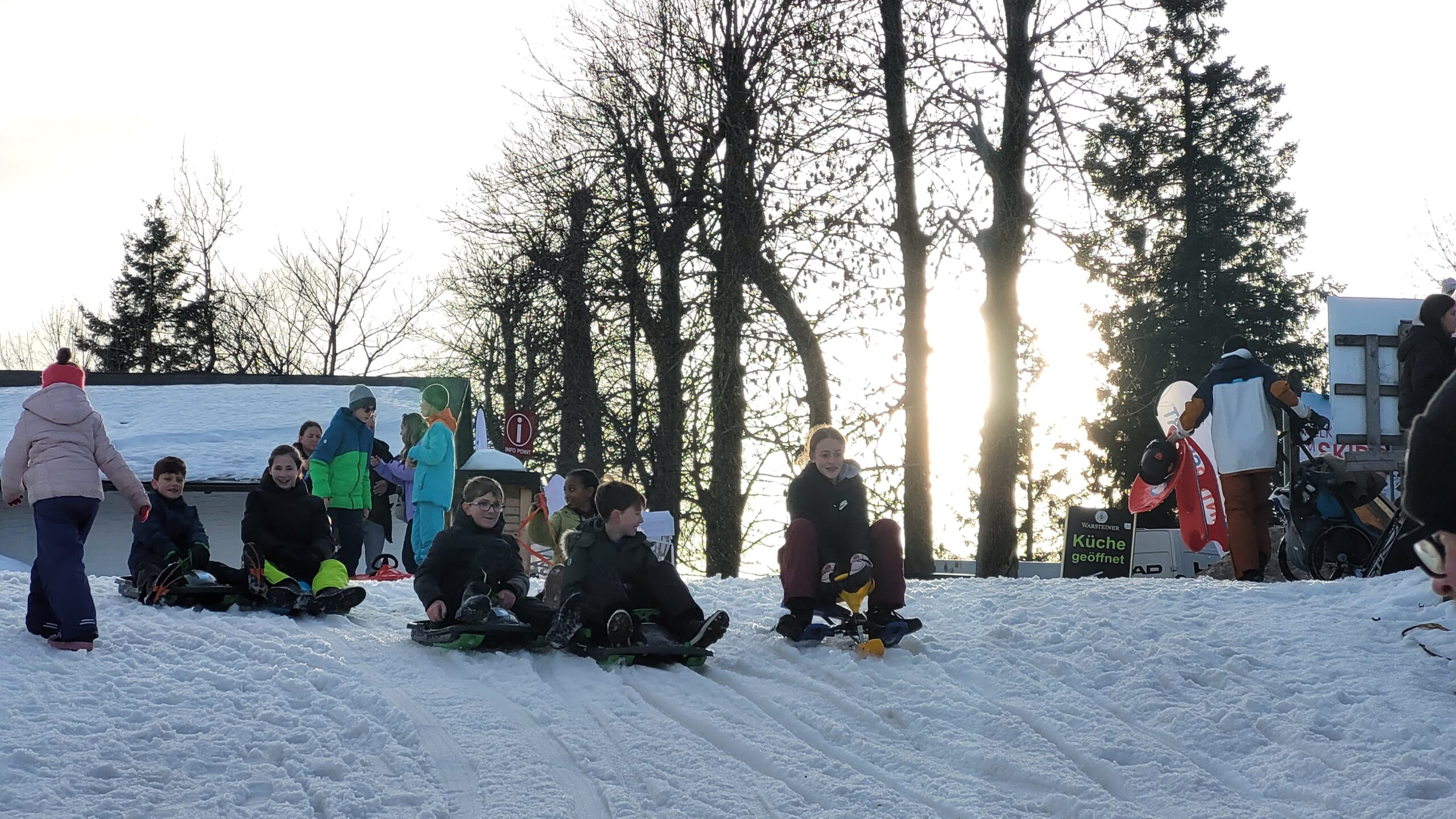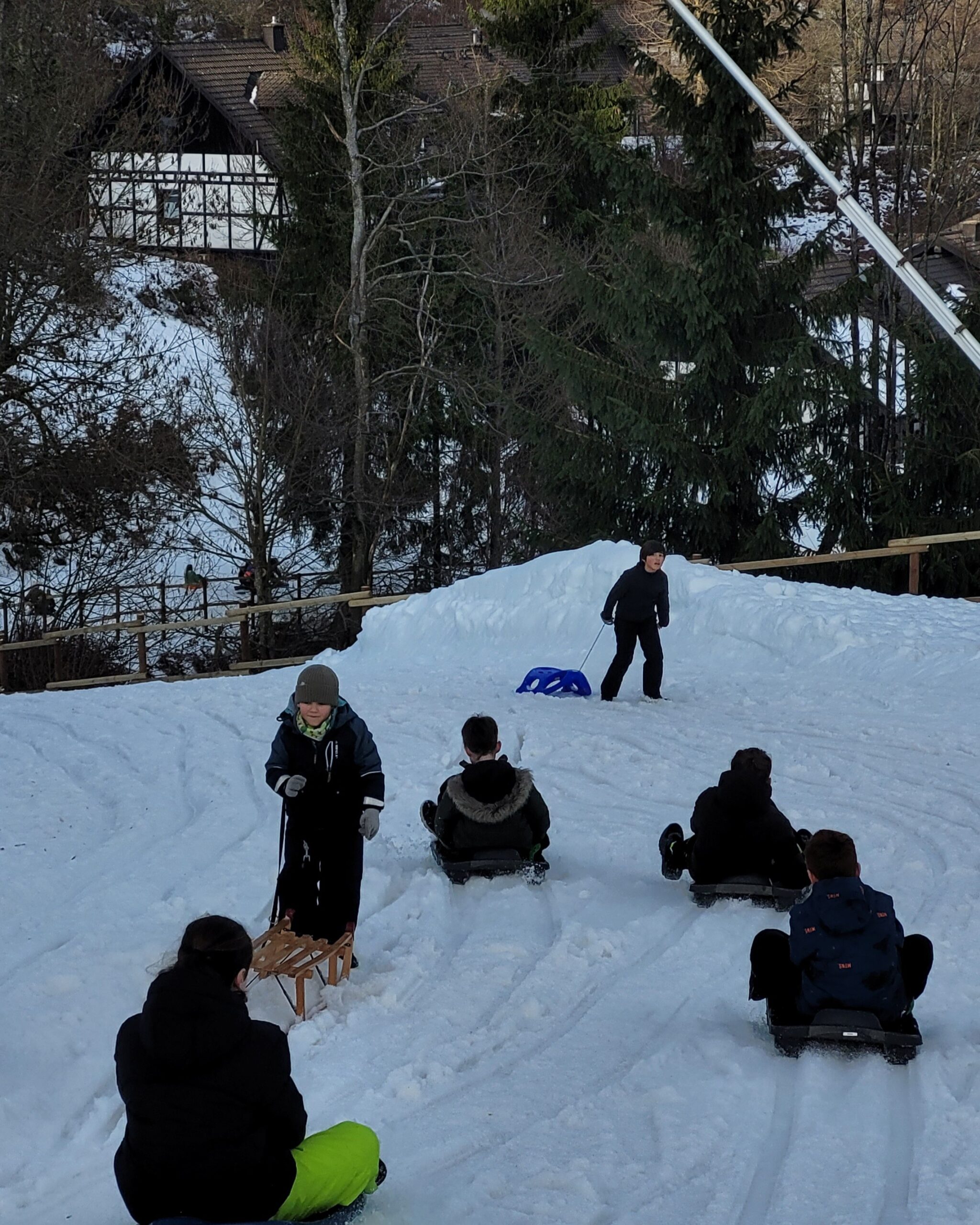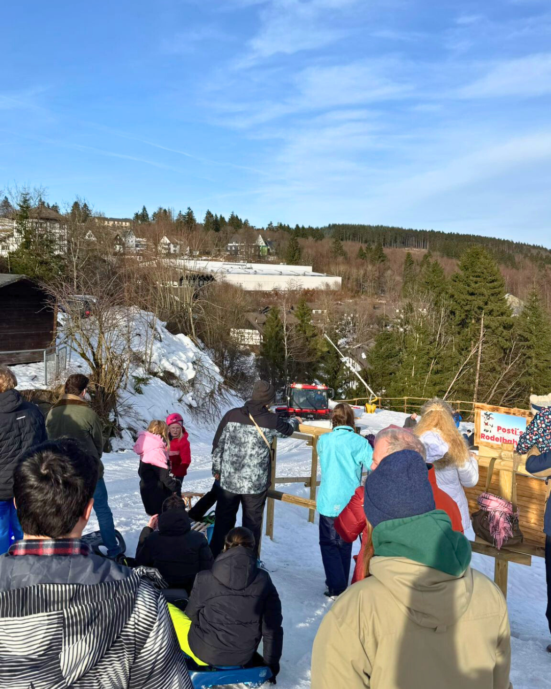 Dort angekommen ging es sofort auf die Rodelpiste. Obwohl das Wetter nicht mehr ganz so winterlich war, war durch den Kunstschnee der Winterspaß gesichert. Unter blauem Himmel ging es das ein oder andere Mal die Natur-Rodelbahn hinunter, um dann vom Schlittenlift wiederhinaufgezogen zu werden. Nur wenige sind zwischendurch von der Piste abgekommen und haben eine Abkürzung durch das kleine Wäldchen genommen.
