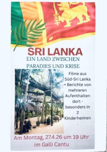 Das Buch + Café Galli cantu lädt am 27. April 2026, 19:00 Uhr, herzlich ein zum Vortrag „Sri Lanka – ein Land zwischen Paradies und Krise“. Wilma Wunderlich erzählt an diesem Abend über mehrere Aufenthalte im ehemaligen Ceylon. Zusätzlich werden Filme gezeigt und über besondere Erlebnisse in zwei Kinderheime in Süd-Sri Lanka berichtet. Wir freuen uns über dein, euer und Ihr Dabei-sein und einen informativen Abend in geselliger Runde – es grüßt das Team vom „Galli cantu“.