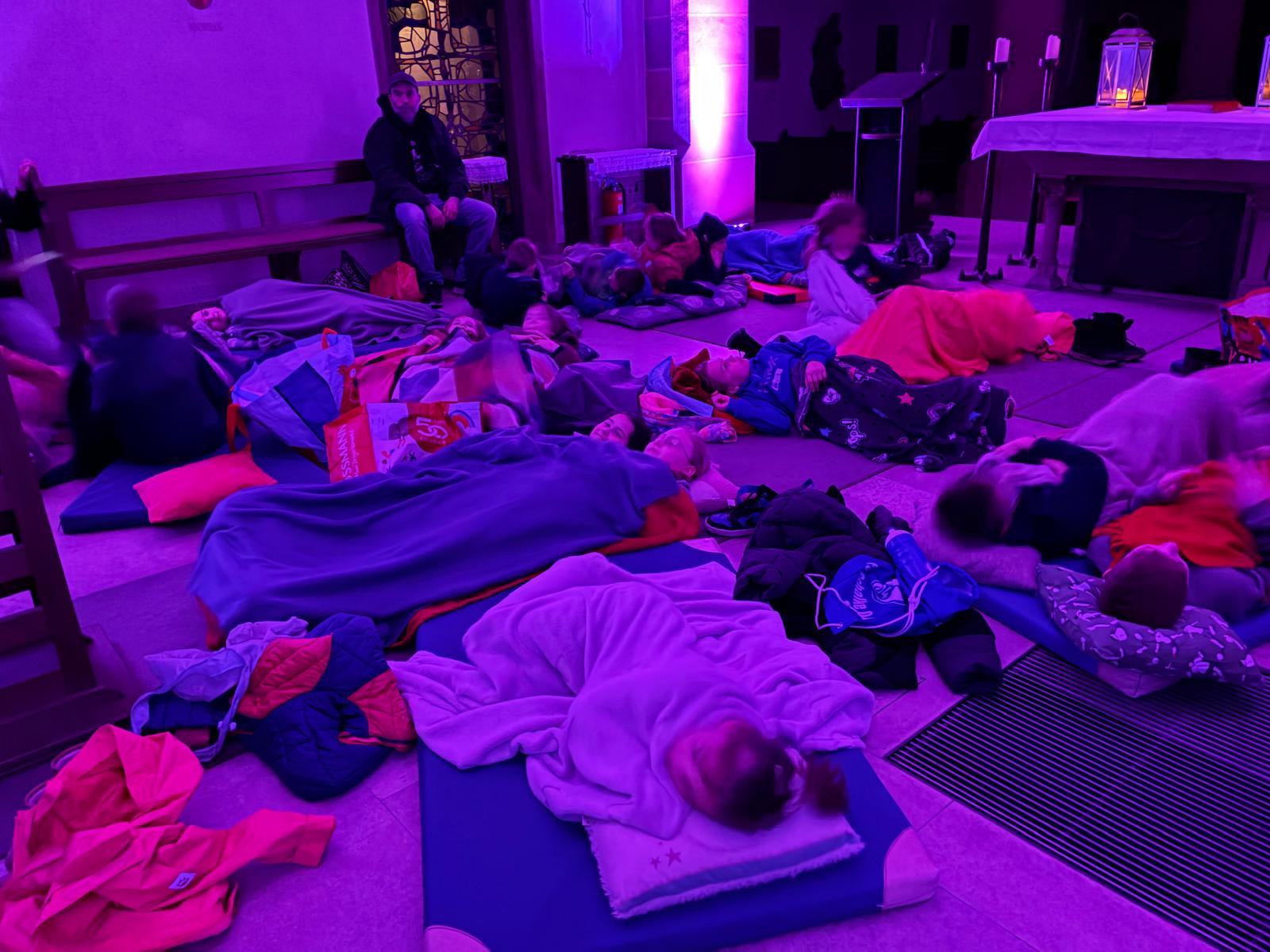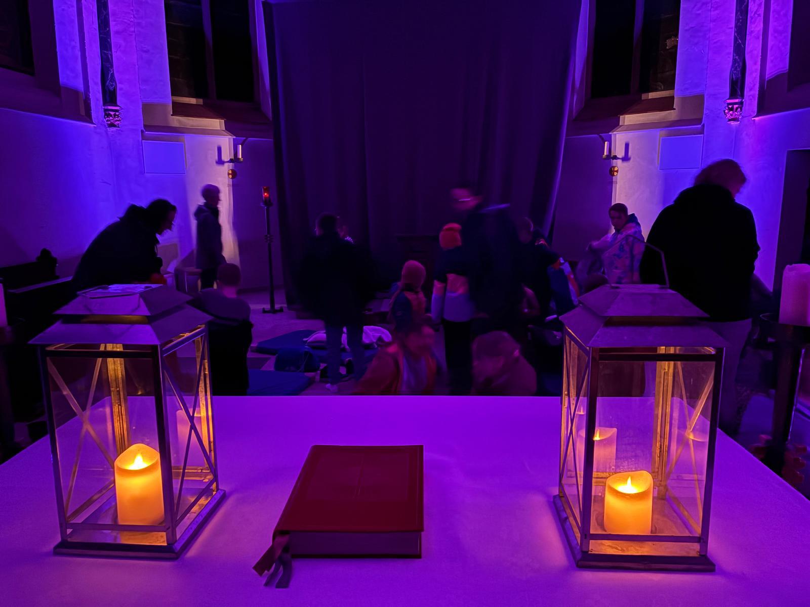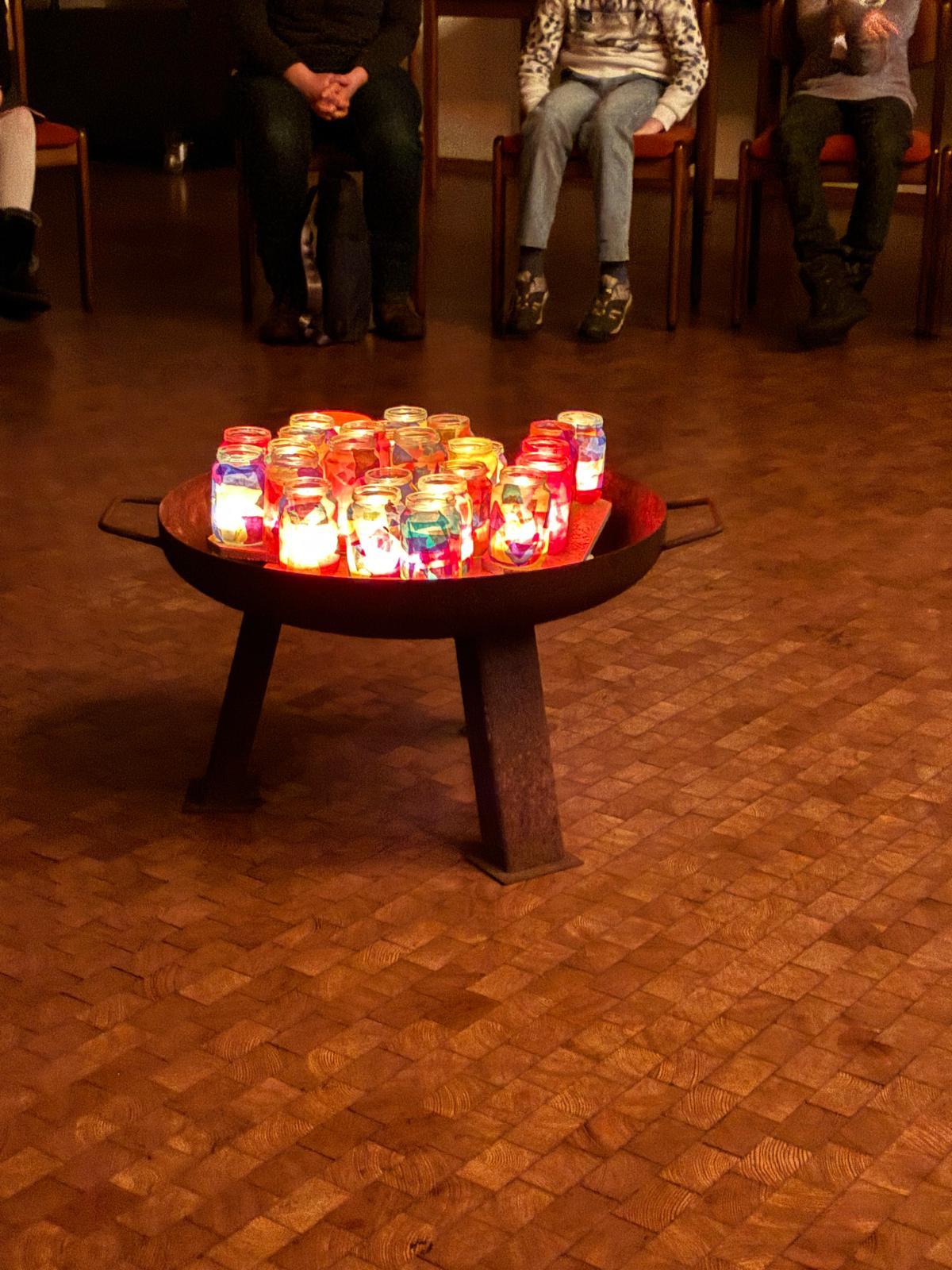 Der Kirchenraum der St. Petri Kirche in Hüsten war nur mit Strahlern und vielen bunten Teelichtgläsern beleuchte und lag ansonsten im Dunkeln. Dadurch entstand eine außergewöhnliche und sehr beeindruckende Atmosphäre, die nicht nur die Kinder in ihren Bann zog. Eingekuschelt in Decken und Kissen lauschten die Kinder konzentriert der biblischen Geschichte „Jona und der Wal“, die von Frau Feldmann erzählt wurde und mit entsprechenden Geräuschen an der ein oder anderen Stelle untermalt war. Ein gemeinsamer Ausklang am (wetterbedingten) improvisierten Lagerfeuer im Petrushaus bei Getränken, leckeren Brötchen der Bäckerei Kneer, Gesang und Gebet rundeten den Abend ab.