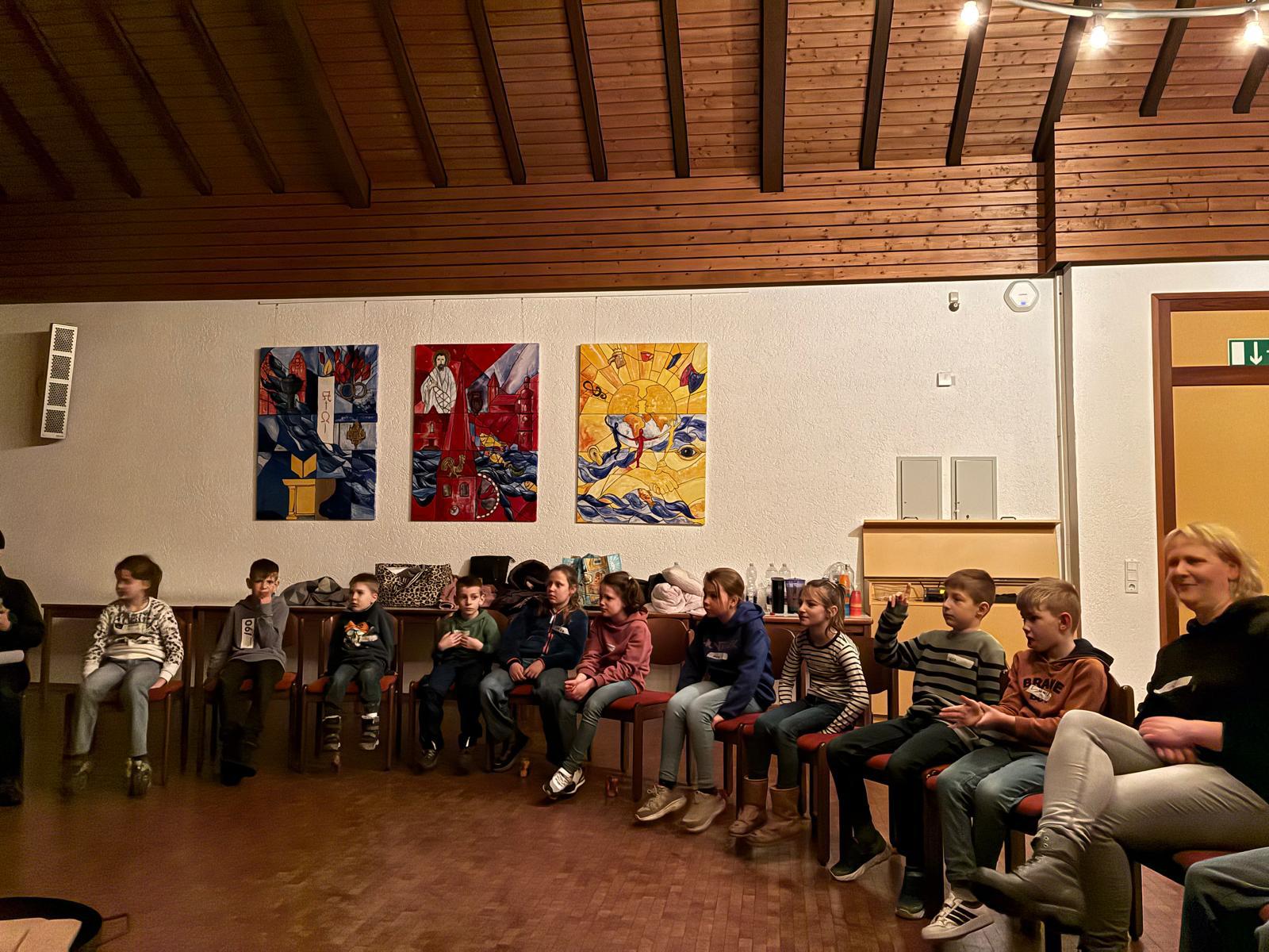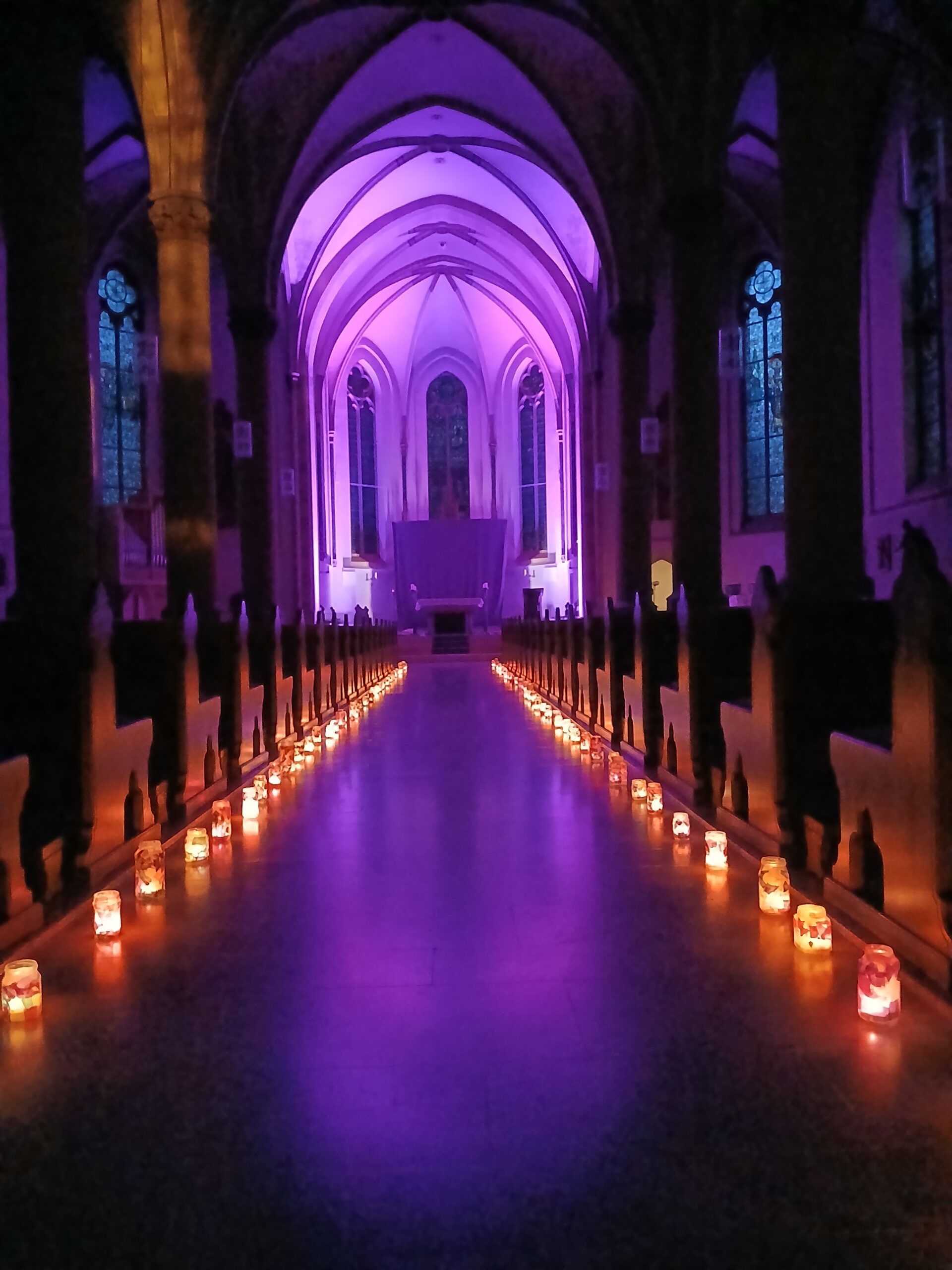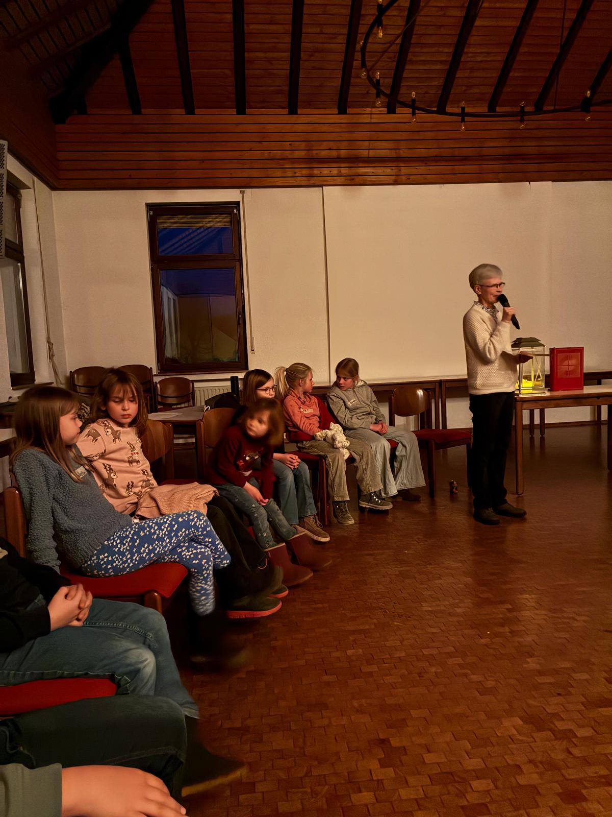 Der Kirchenraum der St. Petri Kirche in Hüsten war nur mit Strahlern und vielen bunten Teelichtgläsern beleuchte und lag ansonsten im Dunkeln. Dadurch entstand eine außergewöhnliche und sehr beeindruckende Atmosphäre, die nicht nur die Kinder in ihren Bann zog. Eingekuschelt in Decken und Kissen lauschten die Kinder konzentriert der biblischen Geschichte „Jona und der Wal“, die von Frau Feldmann erzählt wurde und mit entsprechenden Geräuschen an der ein oder anderen Stelle untermalt war. Ein gemeinsamer Ausklang am (wetterbedingten) improvisierten Lagerfeuer im Petrushaus bei Getränken, leckeren Brötchen der Bäckerei Kneer, Gesang und Gebet rundeten den Abend ab.