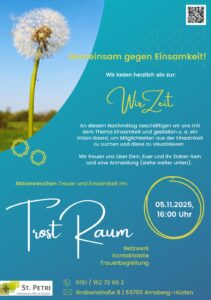 Wir möchten das Thema in diesem Workshop im Rahmen unserer Aktionswochen „Trauer und Einsamkeit“ offen ansprechen und soziale Kontakte fördern – „gemeinsam statt einsam“.